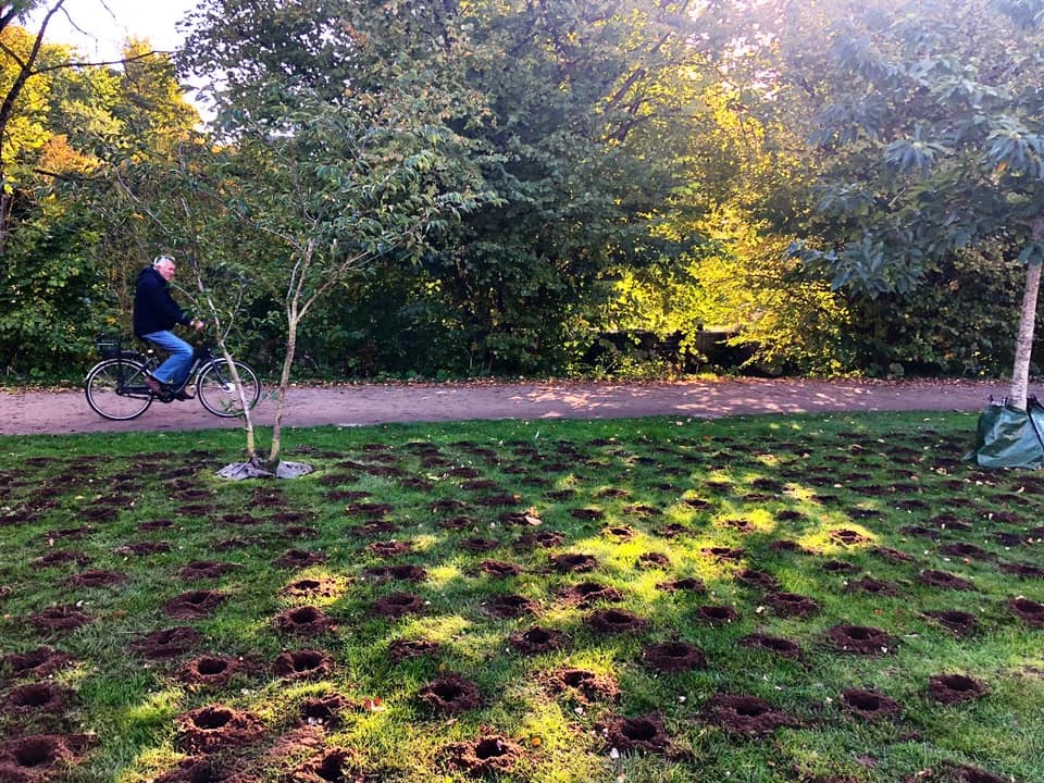 For at skåne plænen og træernes rødder, blev der boret et net af huller i plænen, hvori løgene blev lagt. Hullerne blev dækket til, og allerede nu vokser græsset flot og dækker alle spor af arbejdet.
